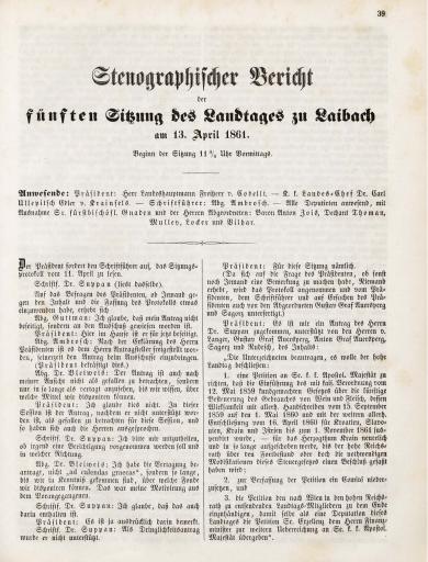 Originalni naslov: Stenographischer Bericht der fünften Sitzung des Landtages zu Laibach am 13. April 1861