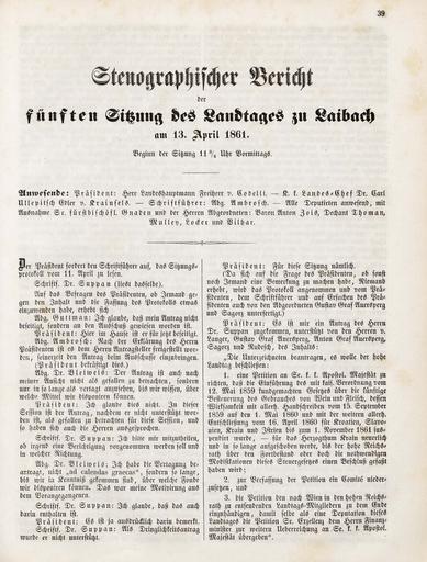 • Stenographischer Bericht der fünften Sitzung des Landtages zu Laibach am 13. April 1861