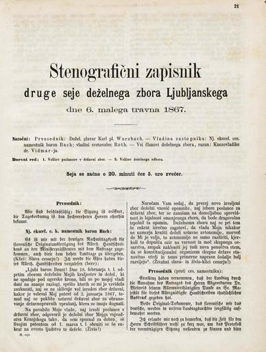 • Original title: Stenografični zapisnik druge seje deželnega zbora Ljubljanskega dne 6. malega travna 1867