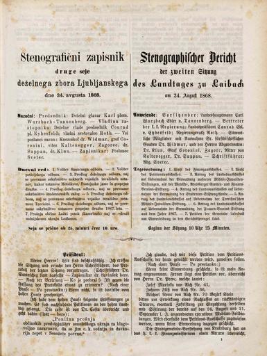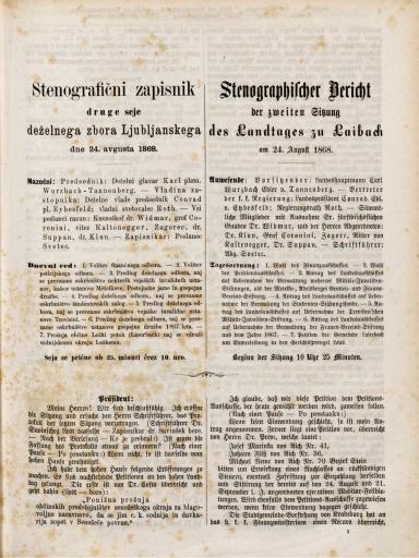 Original title: Stenografični zapisnik druge seje deželnega zbora Ljubljanskega dne 24. avgusta 1868 / Stenographischer Bericht der zweiten Sitzung des Landtages zu Laibach am 24. August 1868