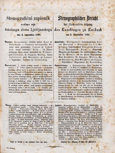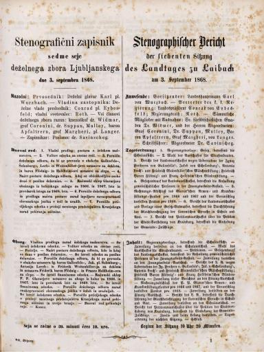 Original title: Stenografični zapisnik sedme seje deželnega zbora Ljubljanskega dne 3. septembra 1868. leta / Stenographischer Bericht der siebten Sitzung des Landtages zu Laibach am 3. September 1868