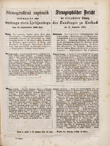 Original title: Stenografični zapisnik štirinajste seje deželnega zbora Ljubljanskega dne 21. septembra 1868. leta / Stenographischer Bericht der vierzehnten Sitzung des Landtages zu Laibach am 21. September 1868