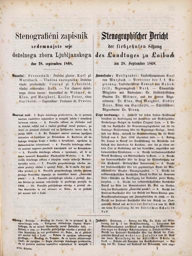 Original title: Stenografični zapisnik sedemnajste seje deželnega zbora Ljubljanskega dne 28. septembra 1868. leta / Stenographischer Bericht der siebzehnten Sitzung des Landtages zu Laibach am 28. September 1868
