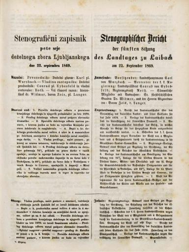 Original title: Stenografični zapisnik pete seje deželnega zbora Ljubljanskega dne 22. septembra 1869. leta / Stenographischer Bericht der fünften Sitzung des Landtages zu Laibach am 22. September 1869