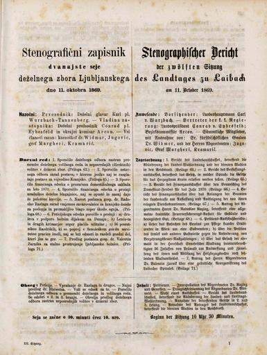Original title: Stenografični zapisnik dvanajste seje deželnega zbora Ljubljanskega dne 11. oktobra 1869. leta / Stenographischer Bericht der zwölften Sitzung des Landtages zu Laibach am 11. Oktober 1869