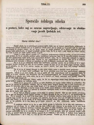 Priloga 111-116 (Sporočilo šolskega odseka o postavi, kako naj se uravna napravljanje, zdrževanje in obiskavanje javnih ljudskih šol, Sporočilo šolskega odbora o obrtnijskih napredovalnih šolah, Poročilo finančnega odseka zarad prihodnje uredbe muzeja, Poročilo ustavnega odseka zastran nasveta gospoda poslanca dr. Savinšeka o varovanji teritorialnih pravic na Žumberk in Marindol, Bericht des Finanzausschusses betreffend den Bau der neuen Landesirrenanstalt, Bericht des Finanzausschusses betreffend den Bau der neuen Landesirrenanstalt)