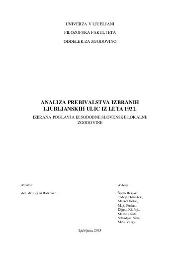 Skupinsko delo, ki smo ga napravili študentje druge stopnje filozofske fakultete v okviru predmeta Izbrana poglavja iz sodobne slovenske lokalne zgodovine, pod mentorstvom doc. dr. Bojana Balkovca ter v sodelovanju z Inštitutom za novejšo zgodovino, predstavlja analizo popisa prebivalstva izbranih ljubljanskih ulic iz leta 1931. V prvem koraku smo avtorji s pomočjo spletnega portala SIstory, katerega upravlja Inštitut za novejšo zgodovino, prepisali digitalizirane originale popisa prebivalstva iz leta 1931 v Ljubljani. Vsak avtor je tako obdelal 200 enot popisa, ki smo jih kasneje uporabili v naših analizah. Popis prebivalstva je po obdelavi dostopen, vsem uporabnikom portala SIstory. Prav s tem razlogom smo se lotili analize popisa, da bi uporabnikom prikazali, na kakšne načine lahko uporabijo omenjeni ali kateri drugi popis, ki ga ponuja SIstory.