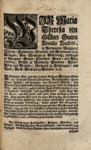 Zbirka raznih patentov, odlokov, predpisov, norm, navodil, okrožnic ipd., ki so jih izdali Karl VI., Marija Terezija in Jožef II.