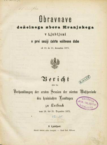 Originalni naslov: Obravnave deželnega zbora v Ljubljani v prvi sesiji četrte volitvene dobe od 18. do 21. decembra 1871.